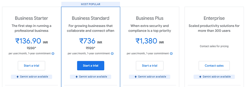 Business Starter: ₹137 per user per month, with 30 GB of storage per user.